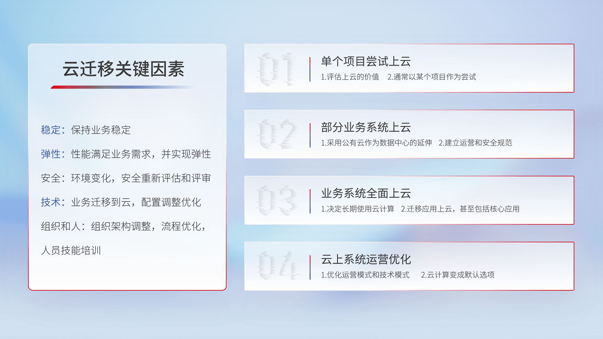 结合实际业务,,从规划设计、、、云平台选型、、、云原生改造、、数据迁移、、、、集成交付,,,迁移全过程为客户识别最佳上云路径,,,,做好风险识别管理,,设计网络架构、、身份权限、、、安全审计合规、、、操作审计、、、、日志审计、、监控告警策略、、、、多站点容灾设计等,,,,对云上基础设施进行整体规划,,提升IT治理水平,,,,以满足弹性、、、高可用、、高性能的需求。。