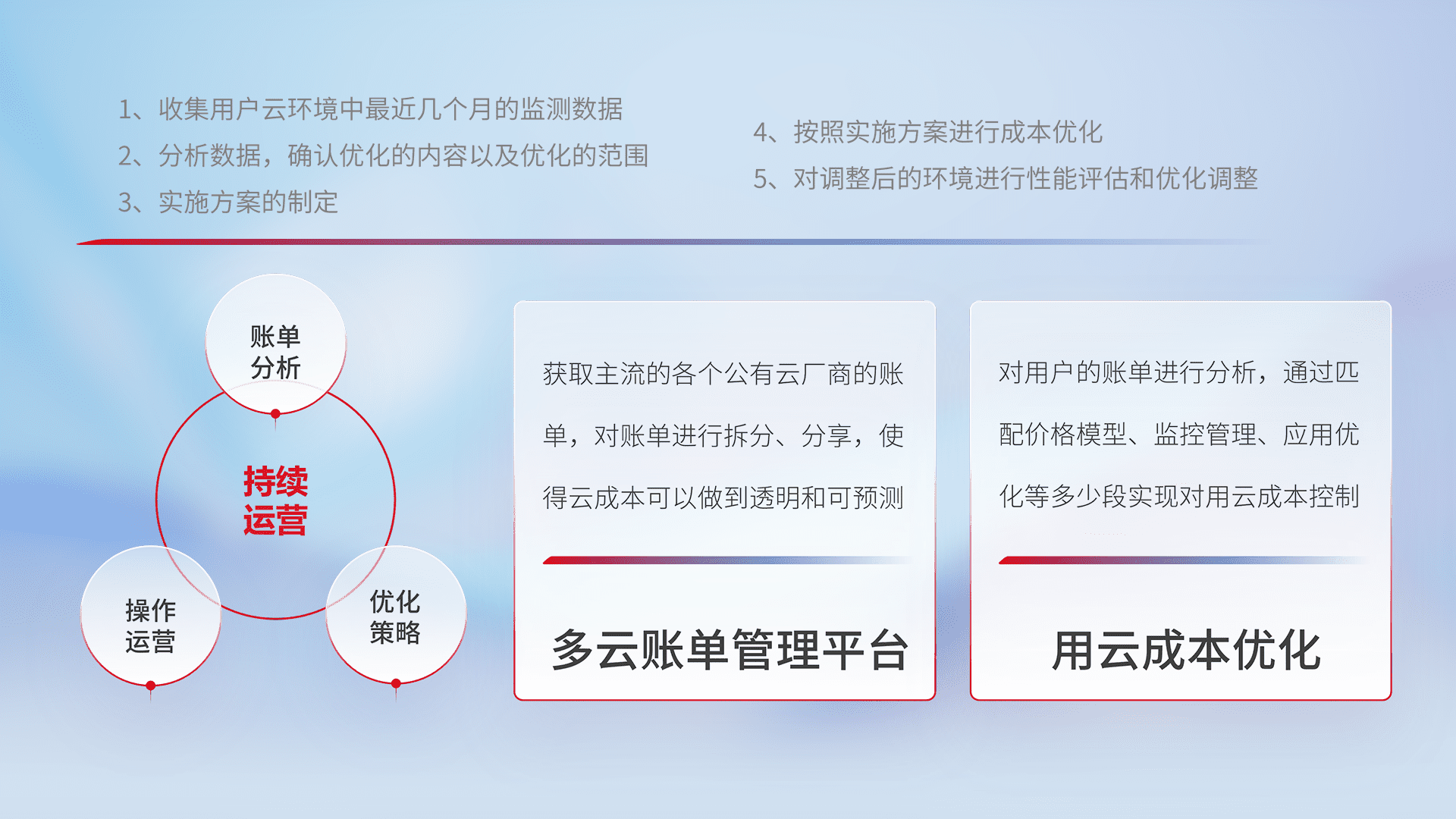 通过多云纳管,,,以统一的资源数据模型把客户的云资源进行抽象和封装,,进而实现对多云资源的统一操作,,,,保障云资源管理的可靠性、、、稳定性与可用性。。。量身定制化运维内容,,,,配置、、、开发运维、、补丁管理、、、、备份、、、监控、、、认证和访问管理、、审计和日常巡检等,,,保障在用云过程中的可靠度,,,稳定度以及高可用率。。。